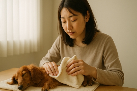 やわらかい布やタオルを用意し、ペットの体をそっと拭いてあげます。特に目や口元は乾燥しやすいため、軽く湿らせたガーゼで拭くときれいに整います。