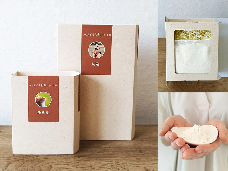 お写真印刷・チャック袋包装・紙製ケースつき。ペットちゃんのご遺骨を粉骨(パウダー加工)いたします。お骨を細かくすることで、やさしく自然に還りやすいお姿になります。