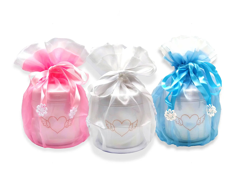 存在感のあるカラーと長いリボンが可愛い骨壺カバー。パールカラーのエンジェル骨壺(別売)とも相性が良く、お部屋にも自然に溶け込みます。