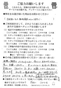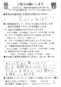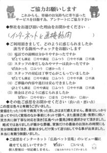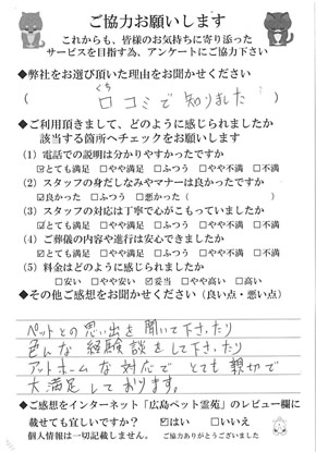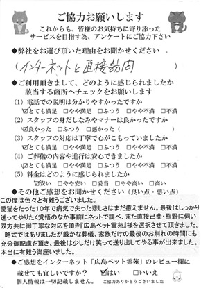 この度は色々と有難うございました。 愛猫をたった10年で病気で失った悲しさはまだ癒えません。最後はしっかり送ってやりたく覚悟のなか事前にネットで調べ、 また直接己斐・熊野に伺い双方共にご丁寧な対応を頂き『広島ペット霊苑』様を選択させて頂きました。 略式ではありましたが厳かな葬儀、家族だけの最後のお別れの時間にも充分御配慮を頂き、最後は少しだけ笑って送り出してやる事が出来ました。 本当に有難う御座いました。